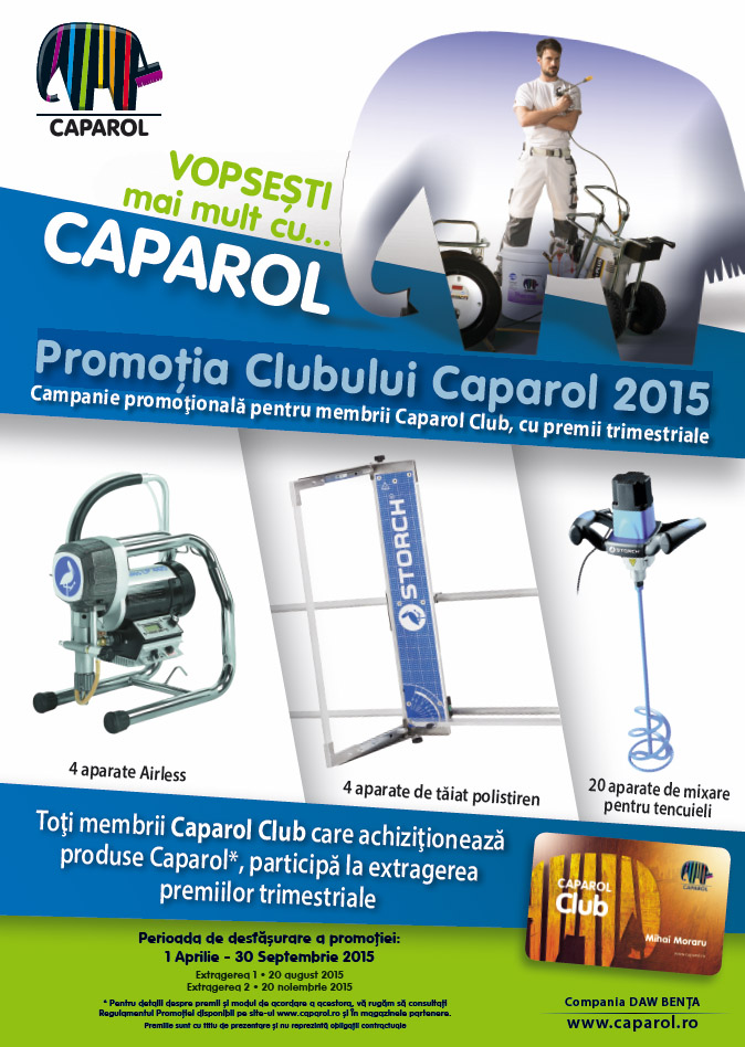 În anul 2015 Caparol Club revine cu provocări care vor ridica profesionalismul și productivitatea muncii tale la noi standarde! Pe lângă premiile trimestriale de care beneficiezi deja (în limita targetelor de achiziţii) alege să fii câştigător şi te poţi bucura trimestrial de unul dintre premiile pregătite special pentru tine!