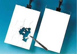 După cum arată testul nostru de laborator efectuat pe lamele de sticlă și prezentat mai jos, „aditivul de aderență la umed” conținut în Amphibolin previne umflarea liantului chiar şi în condiții de umiditate extremă și protejează vopseaua împotriva băşicării şi exfolierii.