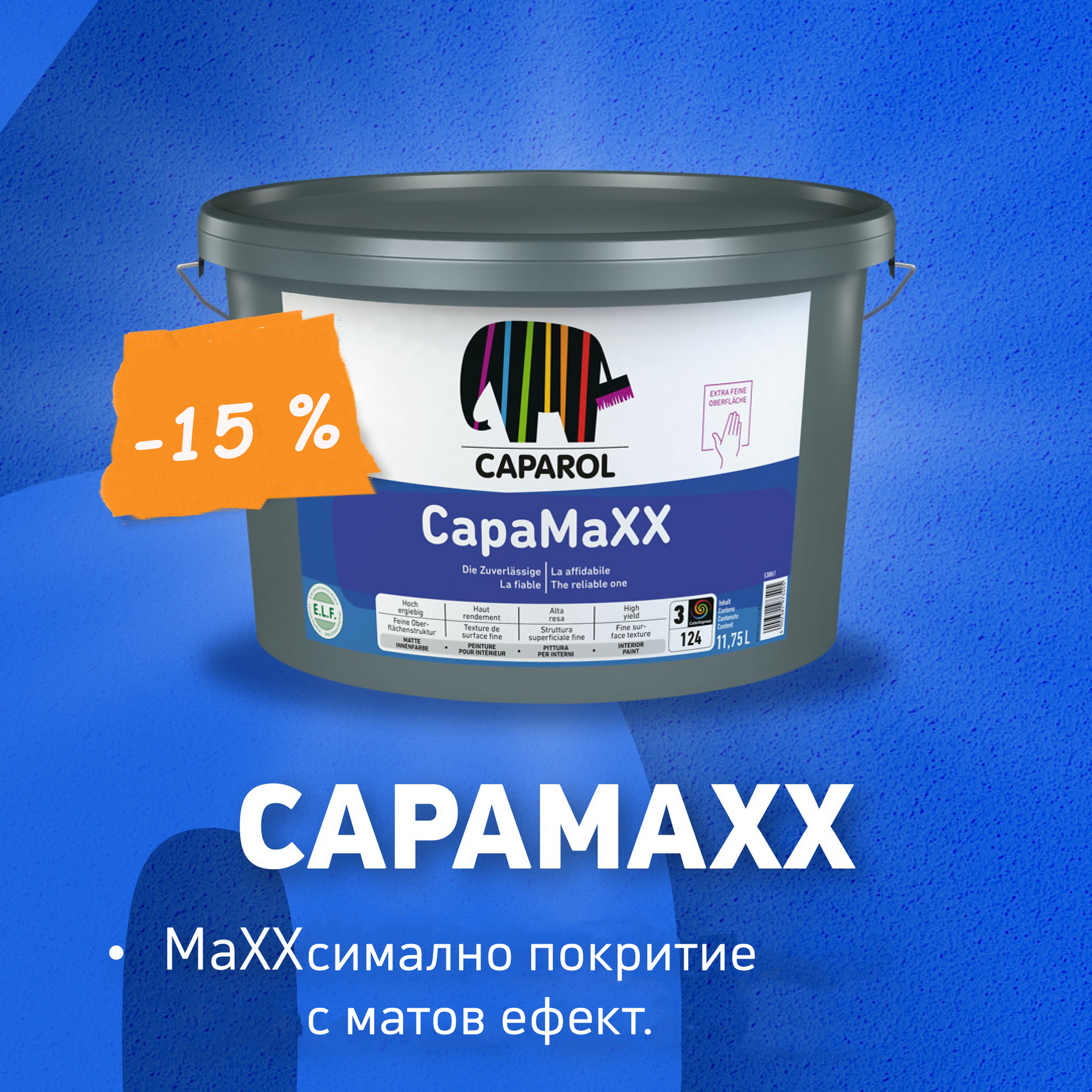 CapaMaxx е матова интериорна боя, с много добра покривност. Предлага се в огромно разнообразие от цветове, дори и в черни нюанси. Лесна за нанасяне и с възможност за почистване на повърхността. Предлага се в различни разфасовки. Може да се нанася както с мече, така и да се нанася с Airless машина.