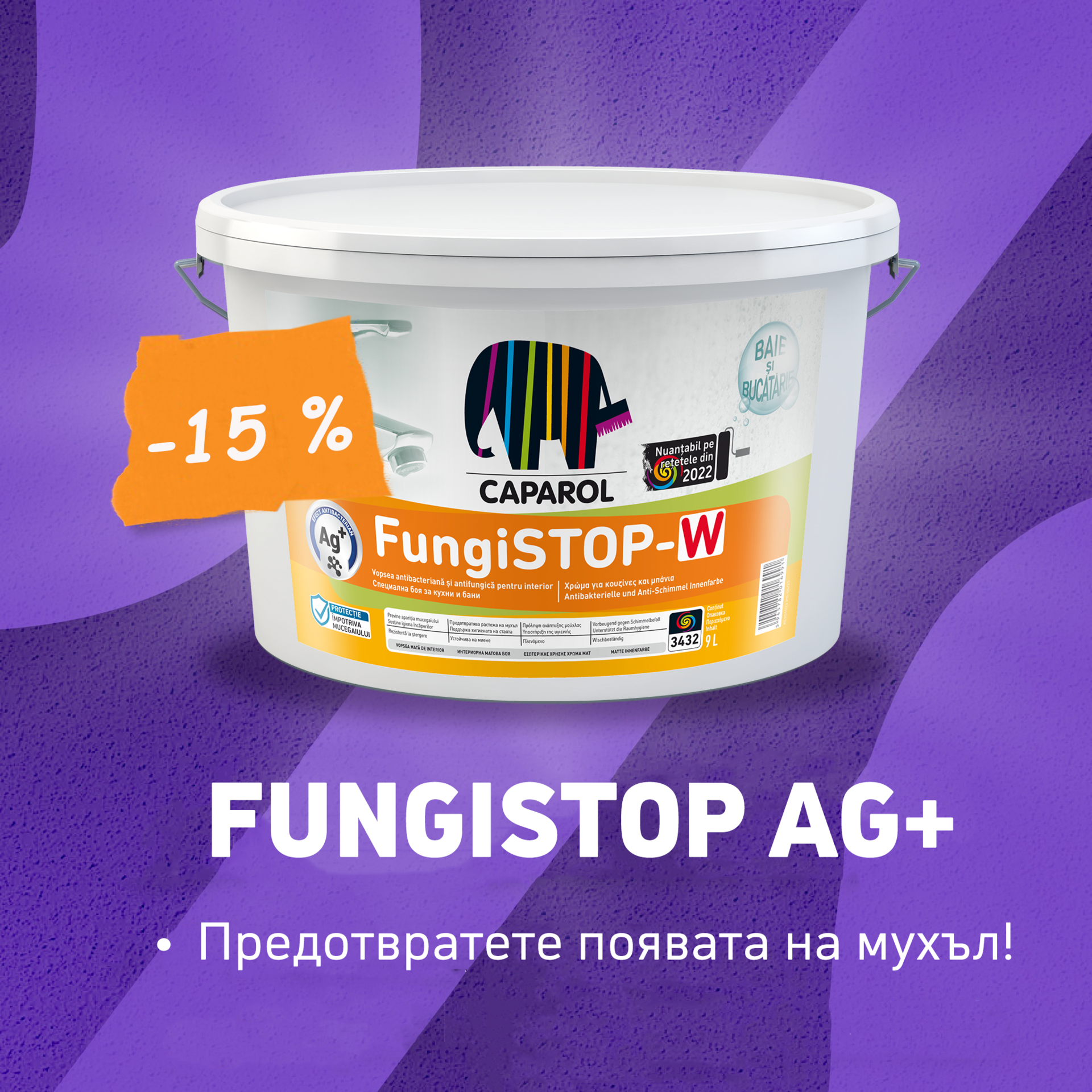FungiStop е специално разработена за мокри помещения и бани, където нивата на влажност са високи. Влагата предразполага развитието на микроби. Формулата на FungiStop Ag+ е обновена, като освен фунгоцидни и протовогъбични свойства, тя вече се отличава и с антимикробна защита.