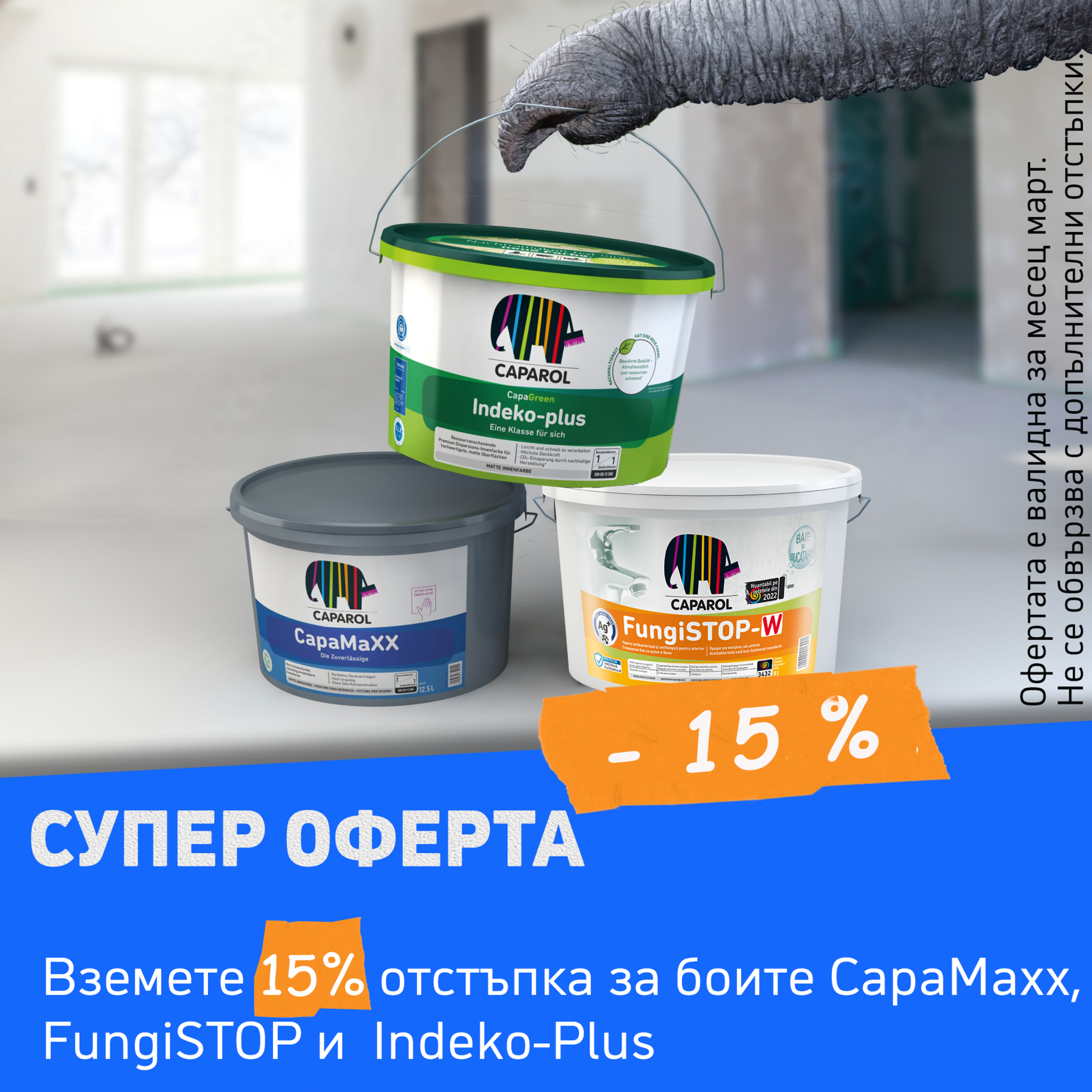 От 1.03 до 31.03 ще получите 15% отстъпка за всяка закупена бака боя Indeko-plus, CapaMaxx или FungiStop Ag+.