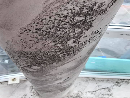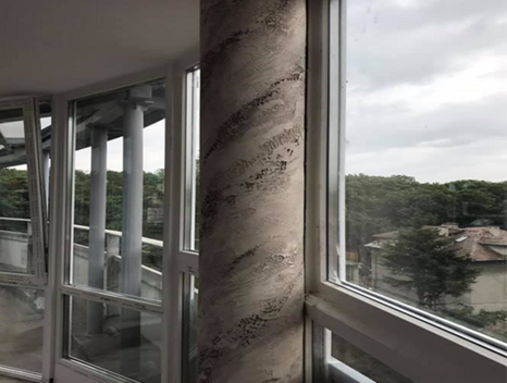 Декоративният ефект "Бетон" е идеален за създаване на акцент в интериора. Точно както е и в конкретния обект. Колоните, които се намират в овалната зона са декорирани с минералната смес Armareno700. Екологична, дишаща, лесна за структуриране и последваща обработка.