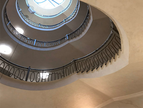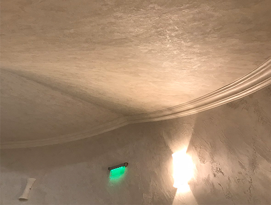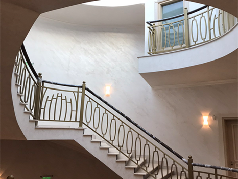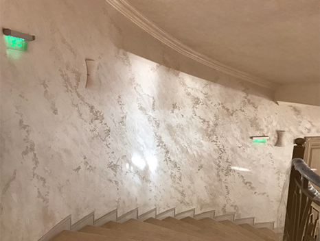 В конкретния обект е използван за стълбищната зона, като след като е структуриран е положен и финишен слон с декоративна мазилка Stucco Eleganza, което придава допълнителен копринен ефект на повърхността.