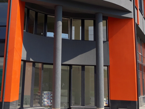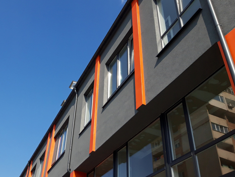 В обекта е използвана Топлоизолационна система Capatect Basic Line, с фасадно финишно покритие Fassadenputz в цвят Venato 15. Оранжевите акценти по колоната са изпълнение с екстериорна боя Amphibolin и Capadecor Metallocryl Exterior в цвят Lachs 110
