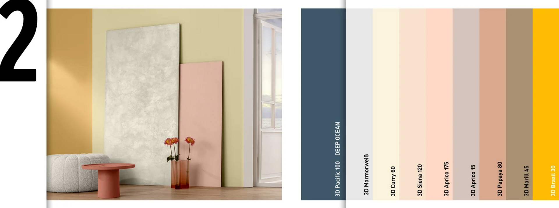 Цветова комбинация 2: Нежните розови и пастелни тонове, съчетани със светли, пясъчни нюанси, създават топлина и лекота. В комбинация с DEEP OCEAN Pacific 100 се създава мощна енергия.