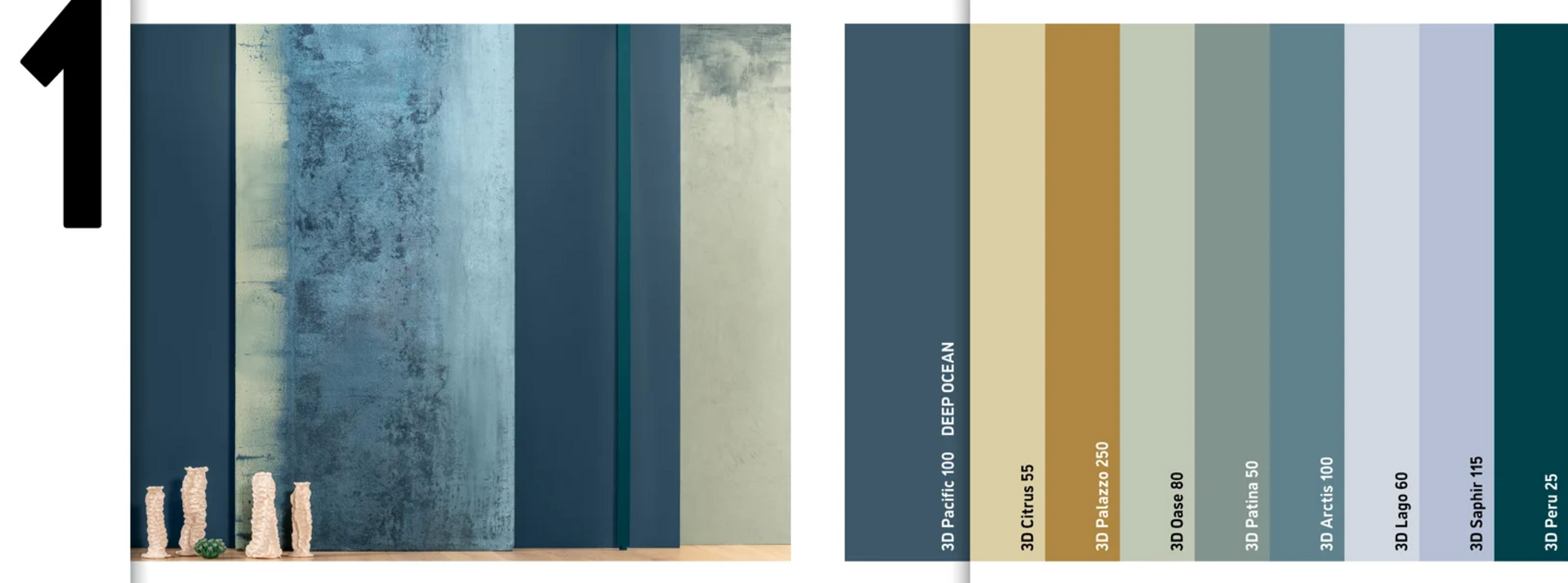 Цветова комбинация 1: Водните нюанси със студени зелени тонове и горчичен оттенък разгръщат динамична жизненост. Ясните сини нюанси, като DEEP OCEAN Pacific 100, отразяват дълбочината и необятността на океана.